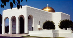 The Iconostasis crafted out of Botticino marble separates the Nave from the Holy Altar. It is a permanent partition and also serves as the frame supporting the mosaic icons. The Royal Gate with its symbolic representations is for the use of the priest, and the two side doors with the guardian figures of the archangels Michael and Gabriel, are for the deacons and altar boys. In the Old Testament, the temple veil separated the Holy of Holies from the main section of the temple. Only the clergy may enter and exit through the Royal Doors , and only at specified times during the Divine Services. It is through these gates that the Heavenly King enters in the form of the elements that will be consecrated into the body and blood of Christ. It is through these gates that Holy Communion is administered to the faithful. The wheat and the vine are depicted on the Royal Doors. The wheat symbolizes Jesus, the bread of life, and the vine symbolizes the words of Jesus who said. "I am the vine, you are the branches". To the right of the Royal Doors is the icon of Jesus Christ followed by the icon of St John the Baptist. To the left is the icon of the Virgin Mary, the mother of God followed by the icon of Sts. Constantine and Helen, the saints for which this particular church was named. The icons of Archangels Michael and Gabriel are depicted on the side doors. To the right of Archangel Michael are the icons of St. Katherine and St. Theodore. To the left of Archangel Gabriel are the icons of Saints Peter and Paul and St. George.